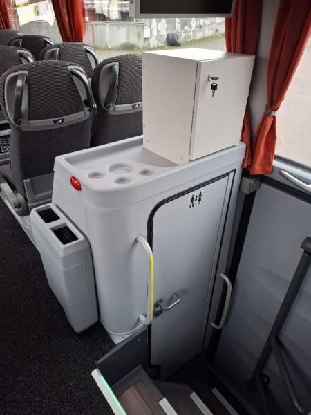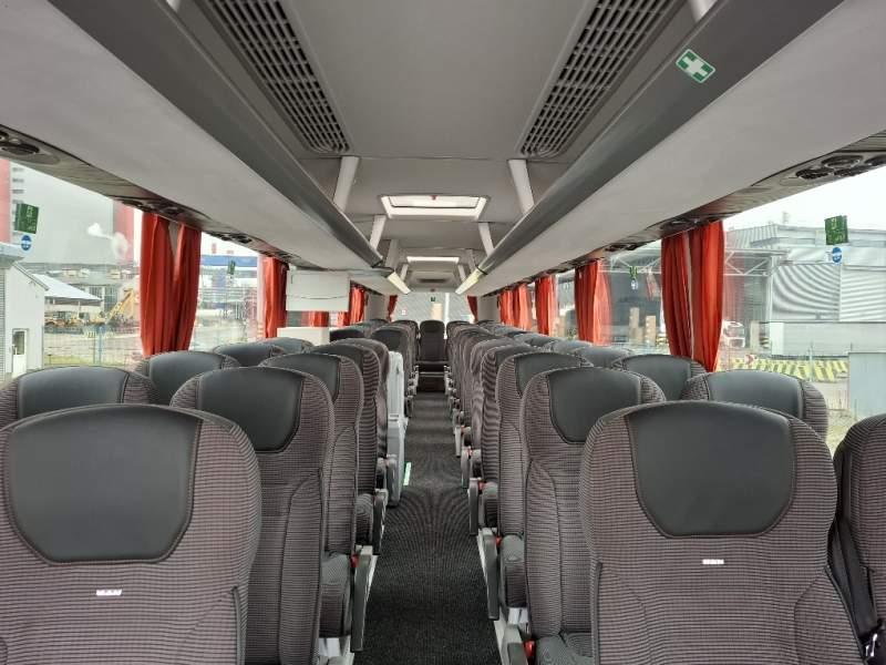: WC, lodówka, caffebar, kabina sypialna, oświetlenie indywidualne, nawiewy dyszowe, siateczki, ABS, ASR, tempomat, retarder, nawigacja, podnóżki, stoliczki, mikrofon, klimatyzacja, radio, sejf, regulacja wysokości nadwozia, centralny zamek, podwójne szyby boczne, wspomaganie kierownicy, elektryczne lusterka, fotele odchylane i rozsuwane, ogrzewanie stacjonarne, hak holowniczy, ESP