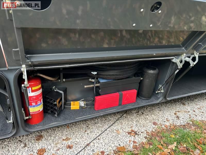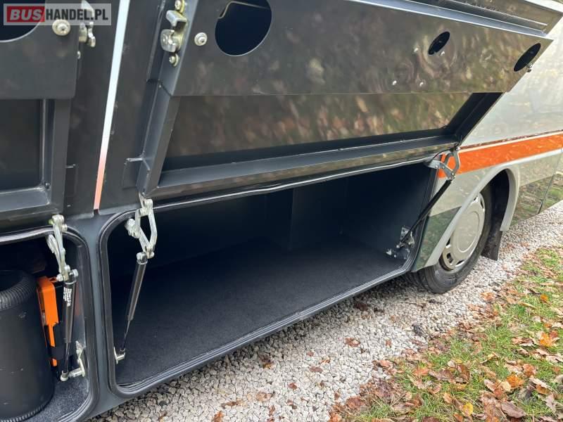 : klimatyzacja, lodówka, oświetlenie indywidualne, nawiewy dyszowe, podnóżki, stoliczki, siateczki, ABS, ASR, tempomat, retarder, CD, mikrofon, radio, fotele odchylane i rozsuwane, podwójne szyby boczne, wspomaganie kierownicy, elektryczne lusterka, ogrzewanie stacjonarne, hak holowniczy