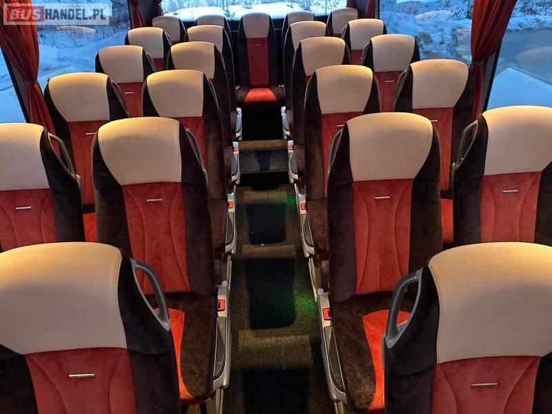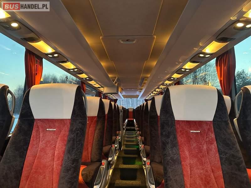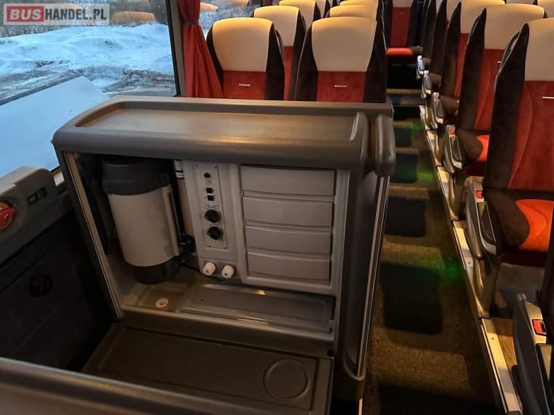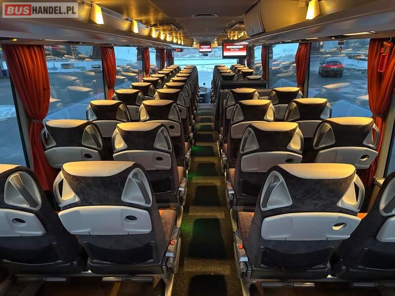 : klimatyzacja, video, WC, lodówka, caffebar, oświetlenie indywidualne, nawiewy dyszowe, fotele odchylane, podnóżki, stoliczki, siateczki, ABS, ASR, tempomat, retarder, telefon, nawigacja, CD, mikrofon, radio, fotele odchylane i rozsuwane, wyświetlacz matrix, sejf, regulacja wysokości nadwozia, centralny zamek, podwójne szyby boczne, wspomaganie kierownicy, elektryczne lusterka, ogrzewanie stacjonarne, DVD, hak holowniczy, ESP