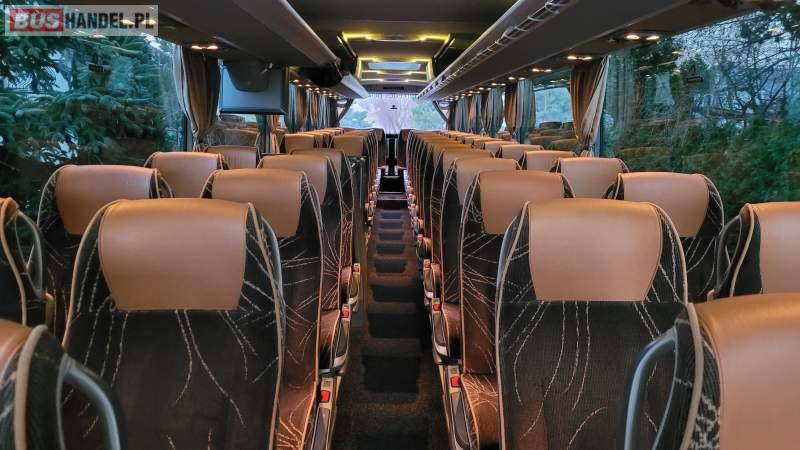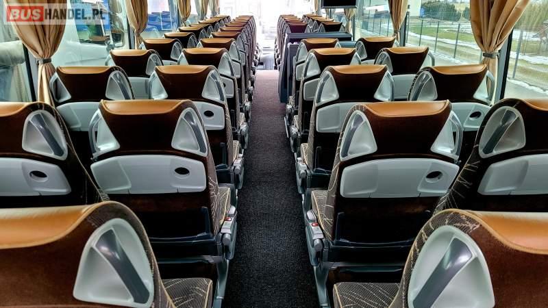 : klimatyzacja, video, WC, lodówka, caffebar, kabina sypialna, oświetlenie indywidualne, nawiewy dyszowe, fotele odchylane, podnóżki, stoliczki, siateczki, ABS, ASR, tempomat, retarder, nawigacja, CD, mikrofon, radio, fotele odchylane i rozsuwane, sejf, regulacja wysokości nadwozia, centralny zamek, podwójne szyby boczne, wspomaganie kierownicy, elektryczne lusterka, DVD, hak holowniczy, ESP