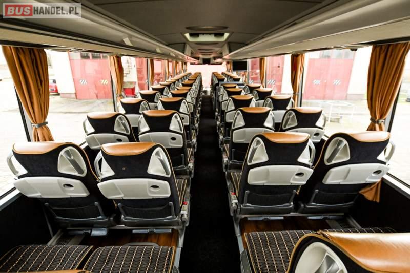 : klimatyzacja, WC, lodówka, caffebar, kabina sypialna, oświetlenie indywidualne, nawiewy dyszowe, podnóżki, stoliczki, siateczki, ABS, ASR, tempomat, retarder, telefon, nawigacja, CD, mikrofon, radio, fotele odchylane i rozsuwane, kuchenka mikrofalowa, wyświetlacz matrix, sejf, regulacja wysokości nadwozia, centralny zamek, podwójne szyby boczne, wspomaganie kierownicy, elektryczne lusterka, ogrzewanie stacjonarne, DVD, hak holowniczy, ESP