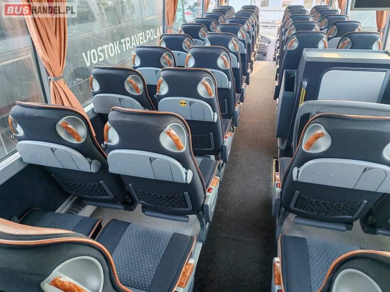 : WC, lodówka, oświetlenie indywidualne, nawiewy dyszowe, siateczki, ABS, tempomat, retarder, nawigacja, CD, podnóżki, stoliczki, mikrofon, klimatyzacja, radio, sejf, regulacja wysokości nadwozia, centralny zamek, podwójne szyby boczne, wspomaganie kierownicy, elektryczne lusterka, aluminiowe felgi, fotele odchylane i rozsuwane, DVD, ESP
